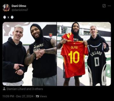 奥尔莫晒出和利拉德互换球衣、做对方经典庆祝动作的照片,配文:⌚️x⌚️。