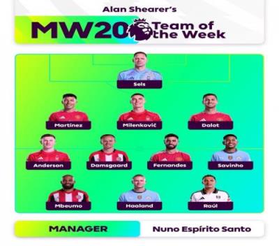 体育资讯1月8日报道宣称 英超第20轮比赛已经全部结束,纽卡名宿希勒评选出了自己心目中的最佳阵容。其中,森林主帅努诺为最佳教练,哈兰德、B费、利桑德罗等人入选。