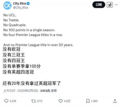 攻击性曼城球迷热帖:没欧冠、没三冠王,20年没拿过英超冠军