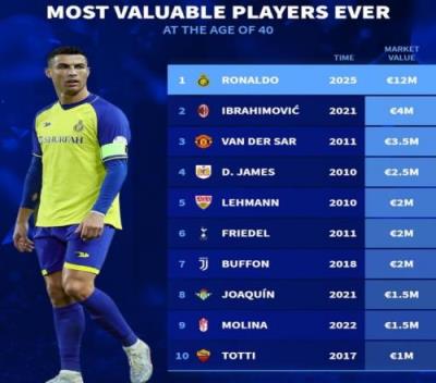 40岁身价最贵榜:C罗1200万欧第1,伊布、范德萨、布冯、托蒂在列