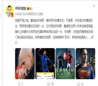 体育资讯01月15日报道宣称 本轮英超,利物浦1-1森林,曼城2-2布伦特福德,切尔西2-2伯恩茅斯。赛后,评述员詹俊发文点评。