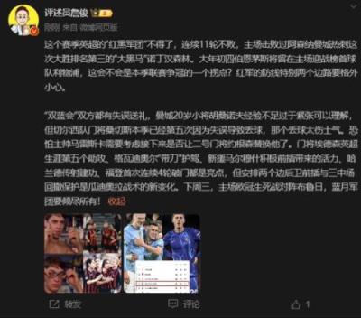 体育资讯01月26日报道宣称 本轮英超多场战罢,著名评述员詹俊在个人社媒上点评了几场比赛。
