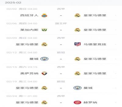 体育资讯1月31日报道宣称 欧冠附加赛抽签仪式结束,皇马将在附加赛对阵曼城,两队争夺一个16强名额!皇马2月份具体赛程如上图。