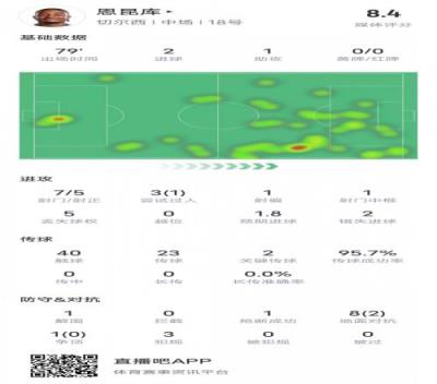 恩昆库本场数据:2射1传+2关键传球&2次错失进球机会,评分8.4