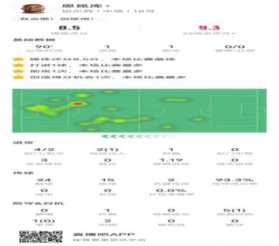 恩昆库本场数据:传射建功&传球成功率93.3%,评分8.5全场最高