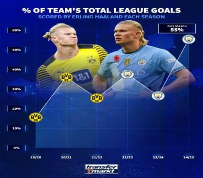 据德转数据统计,本赛季的曼城在进攻端上缺少第二得分手。本赛季曼城在英超打入22球,其中有12球事哈兰德打进的,占到了球队进球数的50%以上。
