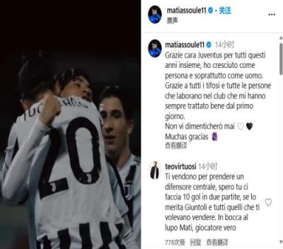 苏莱发布自己身穿尤文球衣比赛的照片,并表示:“感谢亲爱的尤文图斯,和你们在一起的这些年,我已经成长,尤其是作为一个男人。感谢所有球迷和所有在俱乐部工作的人们,他们从第一天起就对我很好。我永远不会忘记你们,非常感谢。”