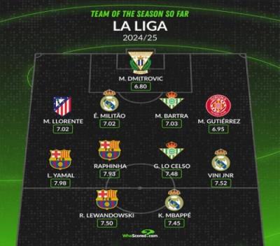 Whoscored赛季至今西甲最佳阵:皇萨各3人,姆巴佩、亚马尔在列
