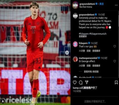 体育资讯1月8日报道宣称 在拜仁大胜萨尔茨堡的友谊赛中,19岁后卫德托尼在第63分钟替补登场,迎来拜仁一线队首秀。在接受赛后采访时,德托尼表示自己梦想成真。