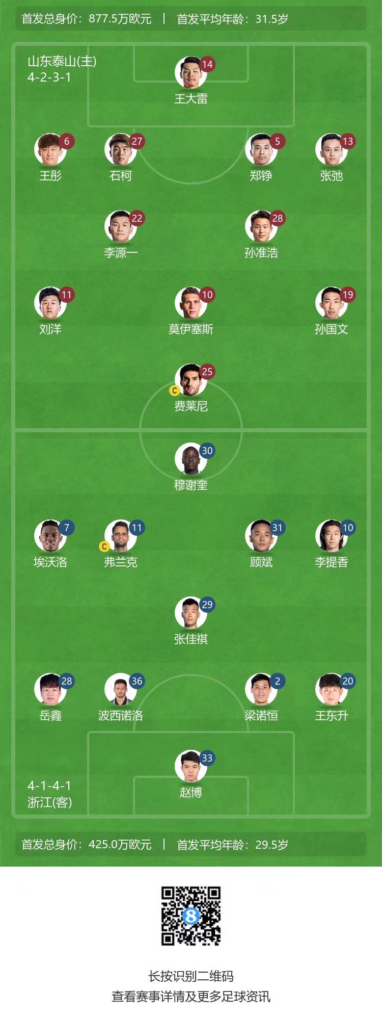泰山vs浙江首发:三外援PK四外援,费莱尼、孙准浩先发