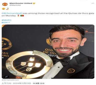 体育资讯11月13日报道宣称 曼联官方更新社媒动态,祝贺队内中场B费在Quinas de Ouro颁奖典礼中获奖。