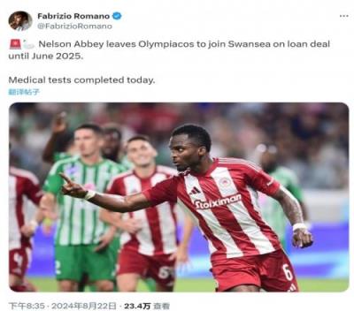 体育资讯8月22日报道宣 据知名记者罗马诺透露,奥林匹亚科斯中卫尼尔森-阿比将租借加盟斯旺西。