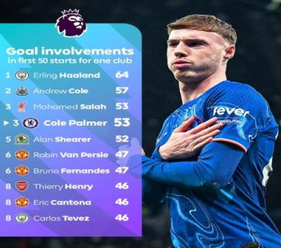 效力单一球队前50场英超首发制造进球榜:帕尔默53球并列第3