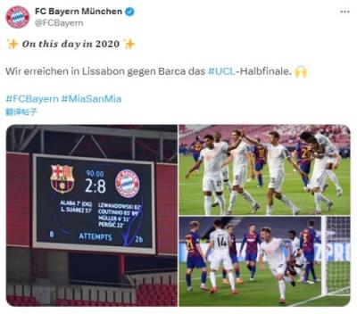 体育资讯08月14日报道宣 2020年的8月14日,拜仁慕尼黑在欧冠八强战8-2血洗巴萨。拜仁官推今日晒出经典比分牌,纪念“拜仁8-2巴萨”四周年。