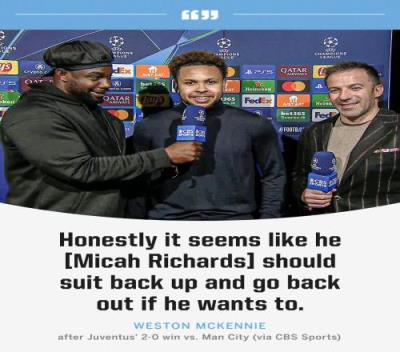 体育资讯12月13日报道宣称 尤文本轮欧冠2-0击败曼城,在赛后采访中,尤文球员麦肯尼打趣了解说嘉宾理查兹。