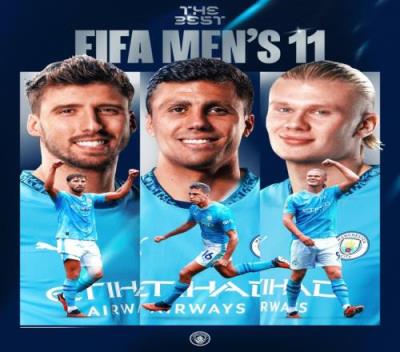 曼城官方社媒晒出海报,对鲁本-迪亚斯、罗德里、哈兰德表示祝贺,配文:“三位曼城球星入选FIFA年度最佳阵容!”