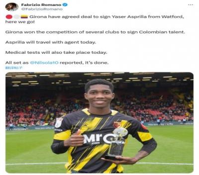罗马诺在社交媒体上这样写道:“赫罗纳从沃特福德签下阿斯普里拉已经达成协议,here we go!赫罗纳击败了多家俱乐部,赢下了签约这位哥伦比亚天才球员的竞争。”