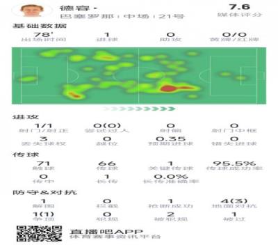 首开记录!德容本场数据:1次射门即破门,5对抗4成功,1关键传球