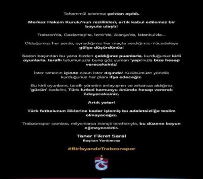今天,特拉布宗再次发文怒喷裁判,他们写道:“我们的副主席塔纳尔-菲克雷特-萨拉尔的声明:我们的容忍度已经超过了极限,裁判委员会的暴行已经到了令人无法接受的地步!”