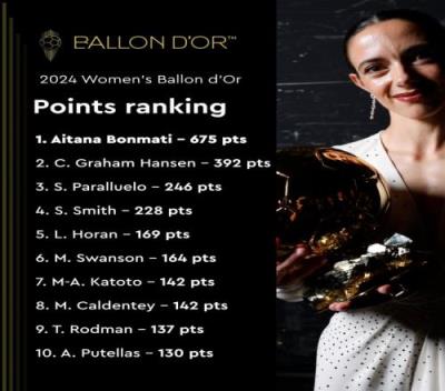 体育资讯11月9日报道宣称 邦马蒂获得2024年女足金球奖,金球奖官方公布了投票分数,邦马蒂675分断层居首,