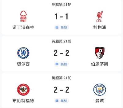 曼城连丢两球被布伦特福德绝平,切尔西则凭借詹姆斯的任意球补时绝平伯恩茅斯,利物浦1-1战平森林。
