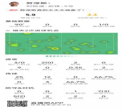 体育资讯12月5日报道宣称 在本轮英超利物浦3-3战平纽卡的比赛中,努涅斯首发表现糟糕。以下为他在本场数据: