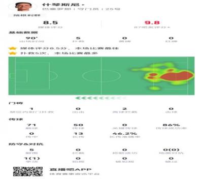 34岁什琴斯尼数据:5次扑救,5次解围,71次触球,全场最高8.5分