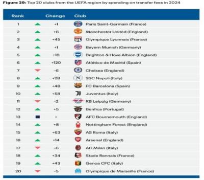 2024年欧足联俱乐部引援花销榜:巴黎、曼联、里昂、拜仁前四