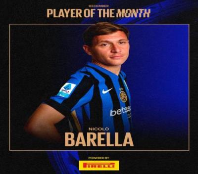 巴雷拉12月为国米出战5场比赛,打进2球,送出2记助攻。国米官方社媒晒出海报,确认巴雷拉当选12月队内最佳球员。