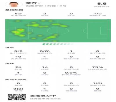 莱万本场比赛数据如下: