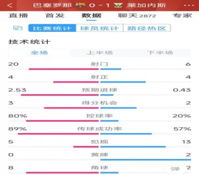空有八成控球率,巴萨01莱加内斯全场数据:射门206,射正44