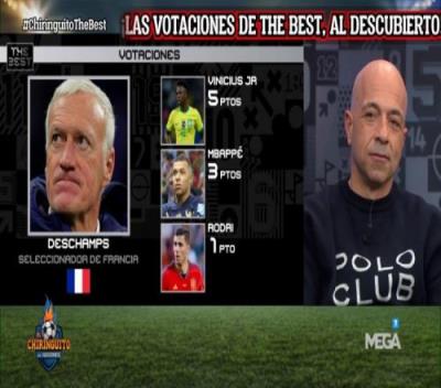 西班牙六台指出,法国主帅德尚、记者莫利内里都没有将第一名投给姆巴佩,记者甚至没有将其列入前三。