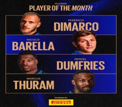 国米公布12月最佳球员候选:迪马尔科、巴雷拉、邓弗里斯和图拉姆