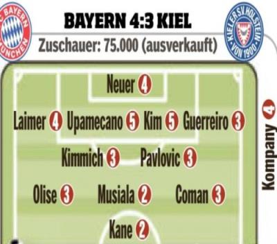 体育资讯2月2日报道宣称 拜仁在本轮德甲4-3击败基尔,《图片报》对拜仁进行了赛后评分,金玟哉和于帕这对中卫组合双双获得最低评分。
