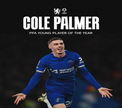 帕尔默在早些时候获评PFA年度最佳年轻球员,他也是切尔西历史上第三位夺得该奖项的球员,并且这些球员全都是在以4为结尾的年份获得的,刚好10年出一位。
