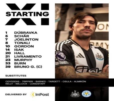 纽卡首发:1-杜布拉夫卡、5-沙尔、7-乔林顿、8-托纳利、10-戈登、14-伊萨克、20-霍尔、21-利夫拉门托、23-墨菲、33-丹-伯恩、39-布鲁诺-吉马良斯