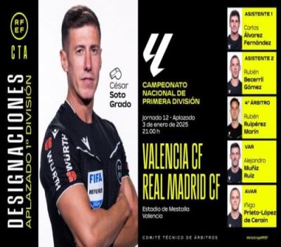 体育资讯1月1日报道宣称 西班牙足协官方消息,塞萨尔-索托-格拉多将执法皇马vs瓦伦西亚的补赛。