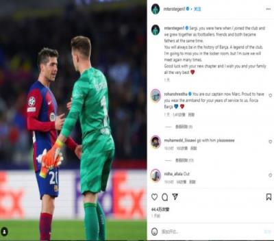 特尔施特根晒出了两人同框的比赛照,并配文:“塞尔吉,在我加盟巴萨时,你就已经在阵中了。我们一起成长,成为了朋友,也同时成为了父亲。”