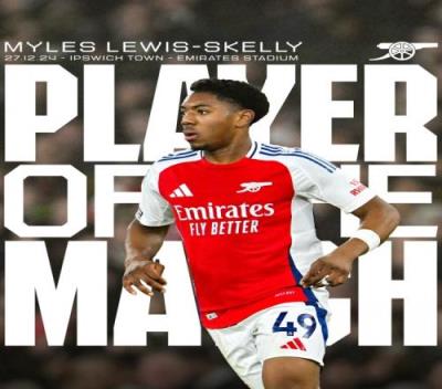 阿森纳官方社媒晒出斯凯利的海报,宣布他当选此役阿森纳队内最佳球员。