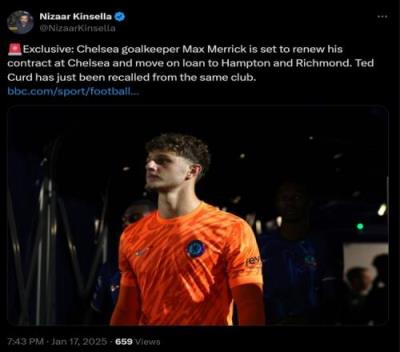 体育资讯1月17日报道宣称 据BBC记者金塞拉独家报道,切尔西19岁门将梅里克即将和俱乐部续约,然后被外租至英格兰第六级别联赛英议南俱乐部汉普顿和里士满效力。