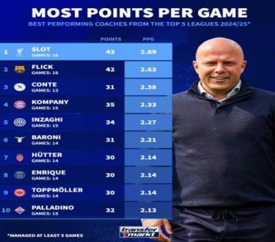 体育资讯11月8日报道宣称 德国转会市场统计了本赛季至今,五大联赛主帅带队的场均积分。其中,红军新帅斯洛特积2.69分排在第一,弗里克2.63分紧随其后,孔蒂和孔帕尼分列第三和第四。