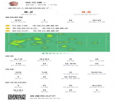 哈兰德本场数据:1进球2关键传球4次争顶均成功,评分8.2