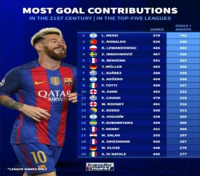 21世纪五大联赛参与进球:梅西743球第一C罗2莱万3伊布4本泽马5