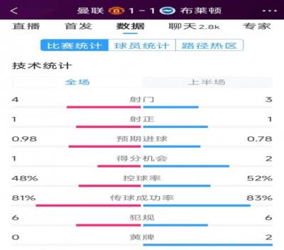体育资讯1月19日报道宣称 本轮英超曼联对阵布莱顿的上半场已经结束,双方暂时1-1战平。以下为双方半场数据对比: