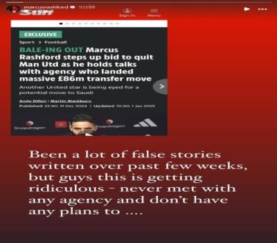 体育资讯1月1日报道宣称 曼联前锋拉什福德今天在Instagram发文,辟谣了《太阳报》关于自己的转会报道。
