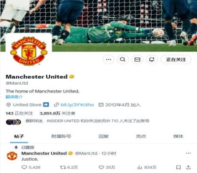 今日凌晨曼联点球大战击败阿森纳,晋级足总杯下一轮比赛。曼联在本场比赛被判罚过一粒争议点球,但是巴因德尔将其扑出,曼联官推将扑救图片设置成为背景。此前曼联还在赛后发文“justice(正义)”并置顶。