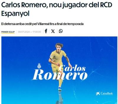体育资讯7月9日报道宣称 西班牙人官方宣布,租借引进比利亚雷亚尔边后卫卡洛斯-罗梅罗。