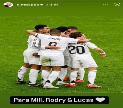 姆巴佩晒出球队抱在一起的照片,并写道:为米利唐、罗德里戈和巴斯克斯加油。