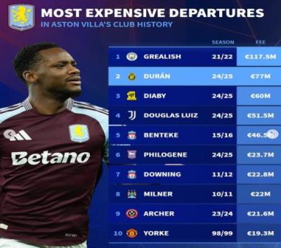 德转列维拉卖人榜:格拉利什1.175亿,杜兰、道格拉斯路易斯在列