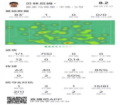 体育资讯12月11日报道宣称 在本轮欧冠皇马对阵亚特兰大的比赛中,贝林厄姆破门得分,以下为他在本场数据: